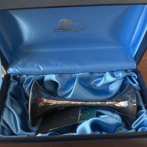 Kultakeskuksen hopeinen Trumpetti kynttilänjalka alkuperäisessä paketissaam keskikokoinen ja hyväkuntoinen