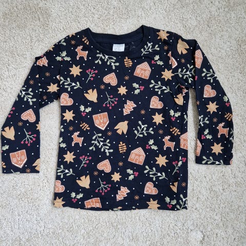 Vihreä joulukuusi paita koko 110. Vastaa mielestäni paremmin koko 104. Ehjä, siisti ja tuoksuton.