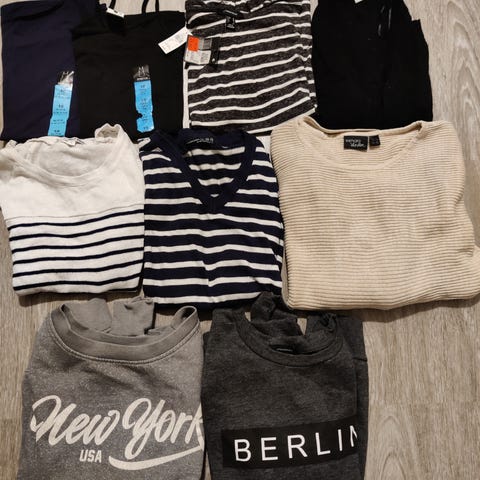 Yö-/oloasuja settinä. Suurin osa S kokoa, sortsit kokoa M ja nauhat eivät kiristävät. Suurin osa uusia. Mustasta yömekosta laput irrotettu, mutta ei käytetty. Harmaata sortsiasua ja mekkoa yksittäisiä kertoja käytetty, samoin vaaleanpunaista t-paitaa käytetty muutama kerta. Lämpösukat käyttämättömät.