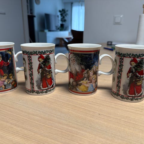 Kaikki neljä mukia ovat ehjiä ja siististi säilytettyjä. Nämä tuovat väriä ja lämmintä fiilistä talven kattauksiin.