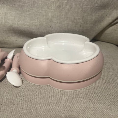 Lasten Baby Björn ruokailusetti, joka sisältää muovisen lautasen, haarukan ja lusikan sekä mukin. Väri keltainen, sopii pienten lasten käyttöön, 4 kk eteenpäin