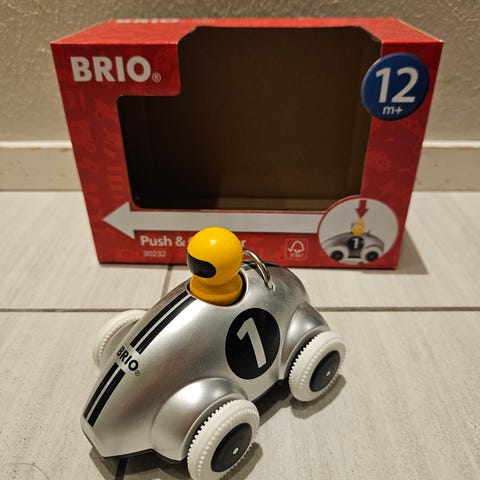 Kuvan mukainen käyttämättä jäänyt BRIOn puinen Push & Go kilpa-auto.