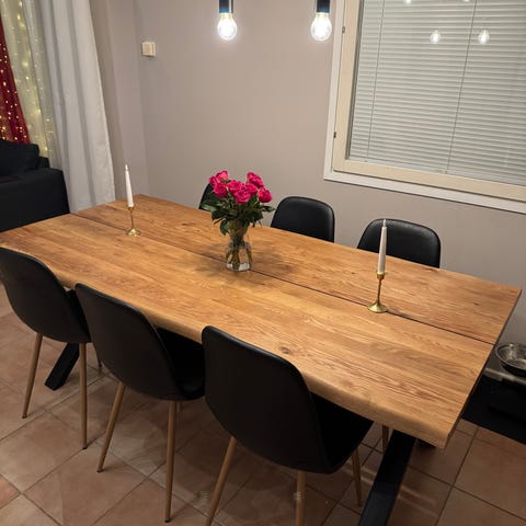 Täyskoivuinen tukeva ja jatkettava ruokapöytä. Jatkopala tuo mittaa lisää n 40cm. Kulumaa ja naarmuja jonkin verran pinnassa.