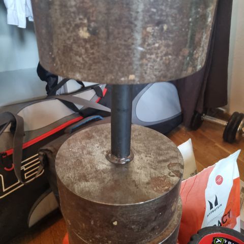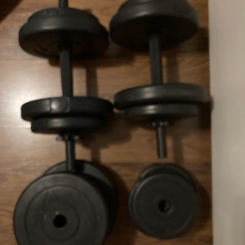 Metallinen käsipainopari, jossa on pyöreät levyt ja suora kahva. Sopii voimaharjoitteluun.