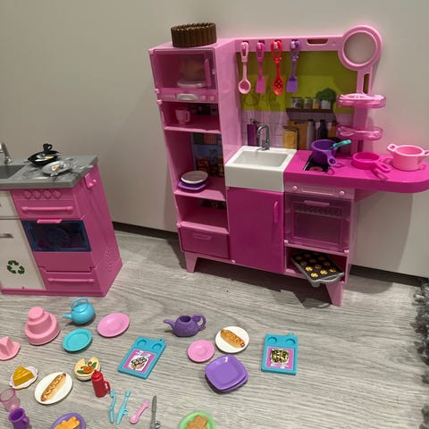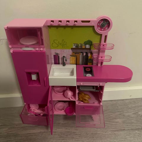Leikkikeittiö barbeille. Keittiöstä lähtee äänet ja valot. Uunin valoa en huomannut katsoa toimiiko, mutta keskimmäisestä uunin napista lähti kyllä äänet ainakin. Otin patterit pois kun käytin vain testatakseni että toimii.