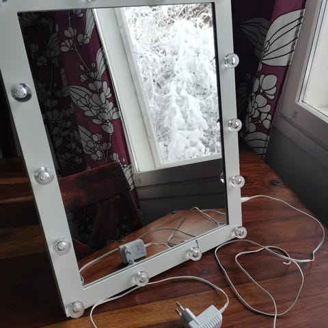 IKEA peili, johon lisätty meikkivalot sivuille. Sopii meikkauspöydälle tai tilaan, jossa tarvitaan lisävalaistusta.