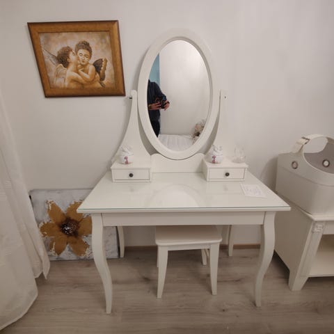 Kampauspöytä vai työpöytä? Sinun ei tarvitse valita – tilaa on riittävästi niin meikeille, kynille kuin kannettavalle tietokoneelle. Pehmeät muodot luovat romanttisen siluetin, josta tulee huoneen keskipiste. Kahdessa pikkulaatikossa sekä pöytälevyn alla olevassa isossa piilolaatikossa on hyvin tilaa meikeille ja koruille. (Normaalihinta 299€).
