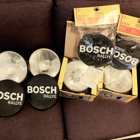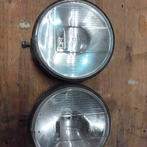 Kaksi kappaletta Bosch rallye 225, lisäpitkät parkeilla ,Volvon logolla. Ollut koneenkuljetusauton katolla, ei ole kiveniskemiä. E- merkintä ja referenssiluku 37,5.