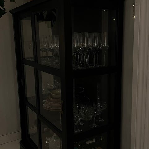 Ikean kalknäs vitriini jossa liukuovet. Muuten siisti kunto, mutta päällä reunassa pari naarmua.