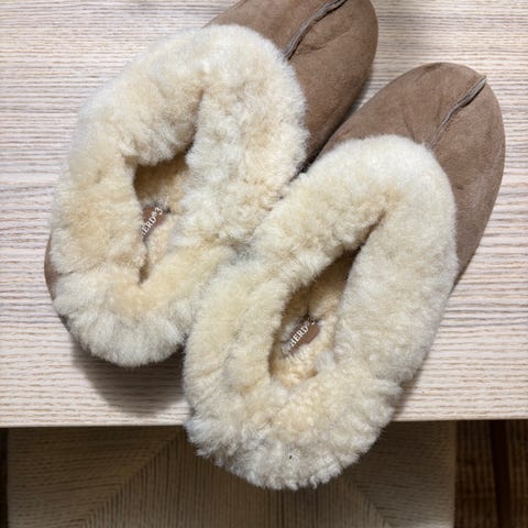 Mustat samettitossut, joissa vaaleanpunainen rusetti. Koko on mielestäni lähempänä kokoa 39, koska tossuissa on tekoturkisvuori.