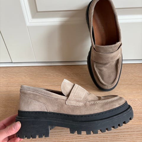 Pari kertaa käytetty. Pohjassa jälkiä materiaalitarrasta ja pari tahraa. Toisen kengän kärjessä pieni jälki kts. kuvat.
