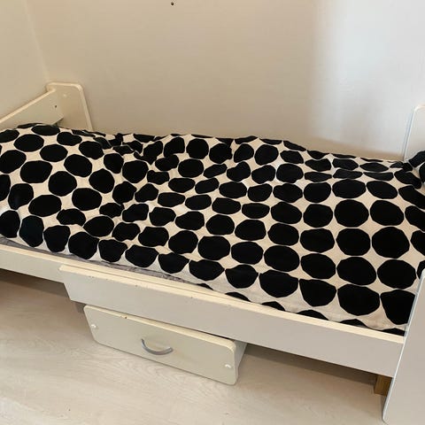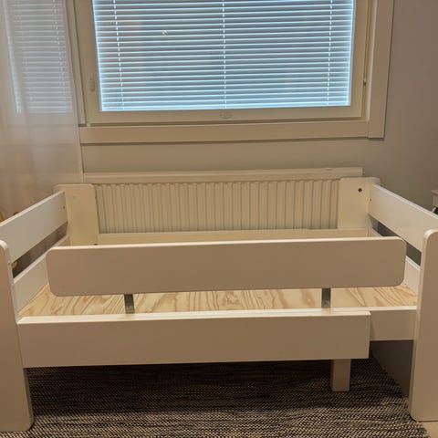 Myydään Unipuun jatkettava lasten sänky (Jatkopuu). Mukaan hylly, lelulaatikko ja patja: voit valita joko 190*80 tai 130*80 + 30 cm jatkopala (ks. kuva) tai molemmat.