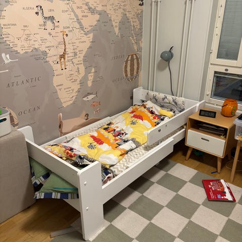 Jatkettava Unipuu-sänky, päätyhylly, lelulaatikko ja patja