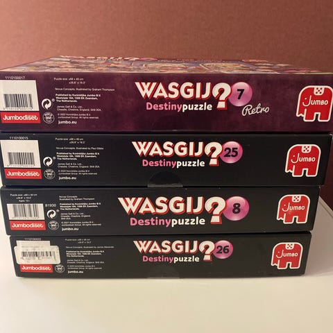 Jumbo Wasgij Original Puzzle -palapelit, neljä erilaista mallia: Rule the Runway, The Restore Store, Retro ja Calm on the Canal. Jokaisessa palapelissä on 1000 palaa.