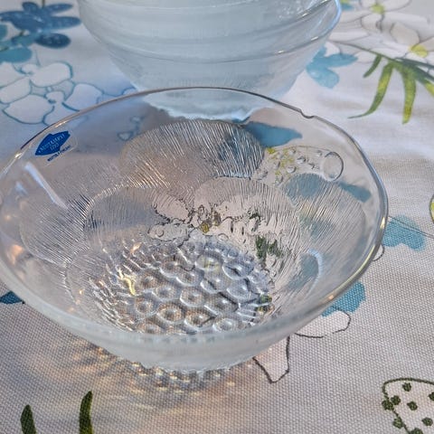 Hyvässä kunnossa olevat Nuutajärven kauniit Pioni-jälkiruokakulhot. Viisi kappaletta. Yhteensä 25 euroa.