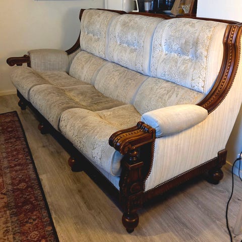Antiikkityylinen samettiverhoiltu sohva puukehyksellä