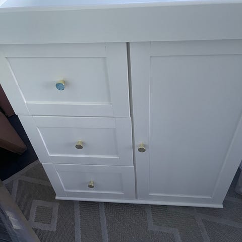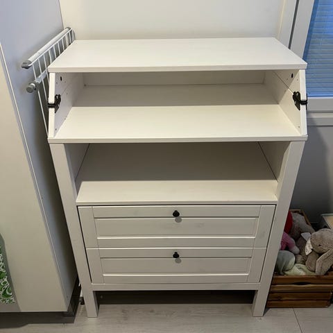 Näppärä ja tukeva hoitopöytä/ lipasto toimivalla ja tilavalla laatikostolla. Kun hoitotaso auki, syvyys 77,5cm. Kolhuja ja elämänjälkiä löytyy, mutta voi ottaa suoraan käyttöön tai halutessaan esim. maalata.
