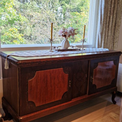 Puinen senkki,päällimmäisessä hyllyssä pieniä käytön jälkiä,yleisilmeeltään siisti