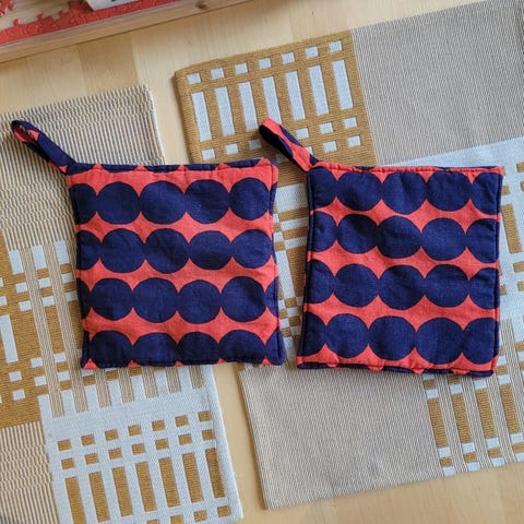 Marimekko pellava patalaput 19 x 24 cm, joissa on tummansininen-oranssi pallokuvio. Muistaakseni Räsymatto kuosi. Sopivat kodin sisustukseen eri vuodenaikoina. Hinta 4 euroa kpl. Voin lähettää. Mmm.