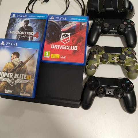 PlayStation 4 -pelikonsoli ja kaksi peliä