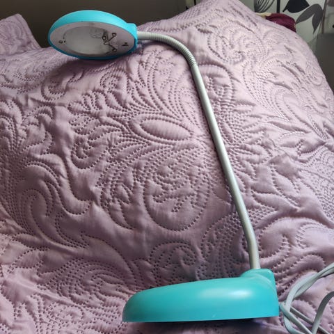 Punainen pöytälamppu. Varjostin kuuluu olla vino.