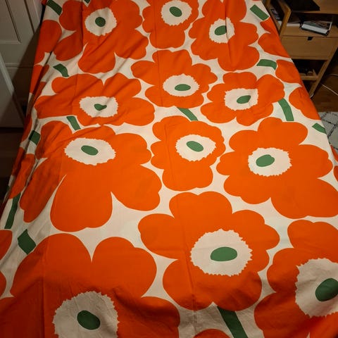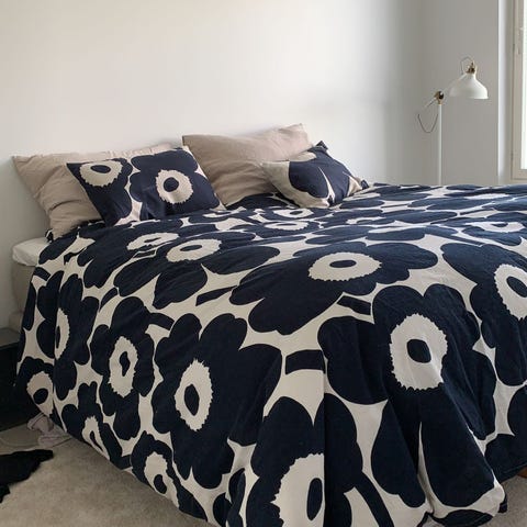 Uusi Marimekon tummansininen unikko pussilakanasetti