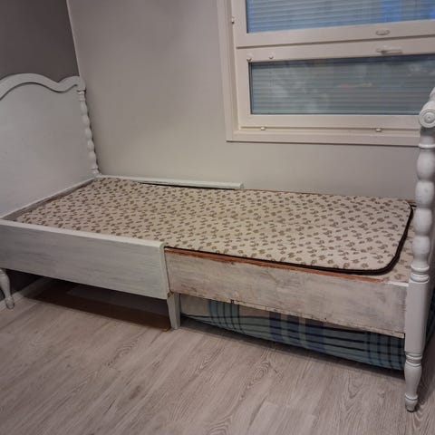 Sänky on ehjä ja siistissä kunnossa. Mukana tulee kaksi erillistä patjaa sekä yksi iso patja – kaikki hyväkuntoisia.