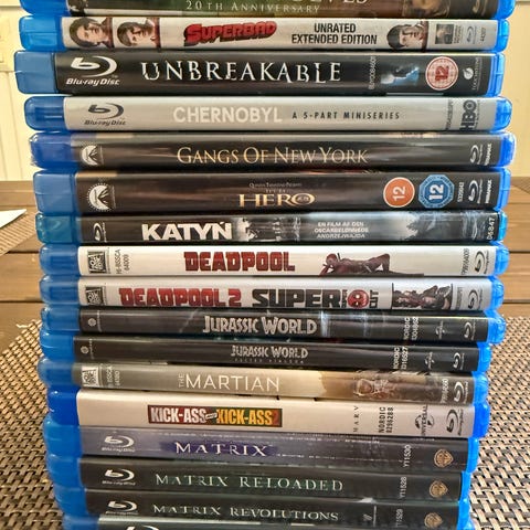 Blu-ray elokuvat: Godzilla King of The Monsters, Predator Collection, The Lost World Jurassic Park, Meg 2, The Dark Knight trilogy, Jurassic Park III, Suicide Squad, Man of Steel ja Valerian.