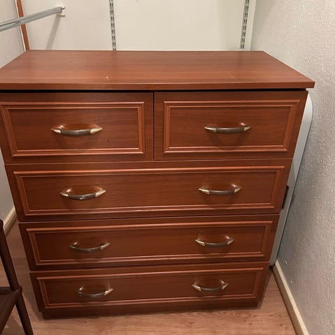 Valkoinen puinen lipasto. Oven takana kolme hyllyä.