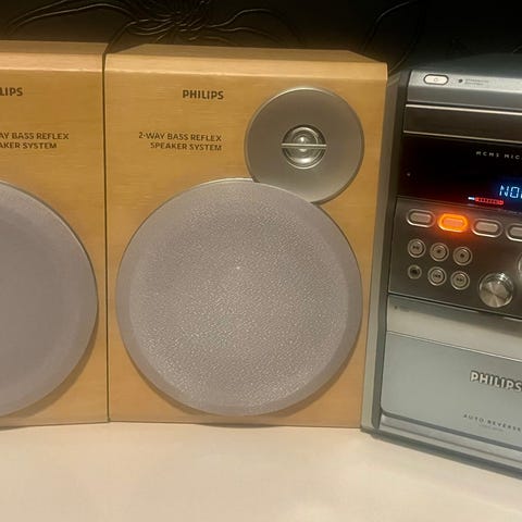 Philips stereot ja Sony kaiuttimet. CD luukku ei aukea ja kasettisoittimesta toimii vain toinen pesä. Radio toimii. Kaiuttimet hyvät.