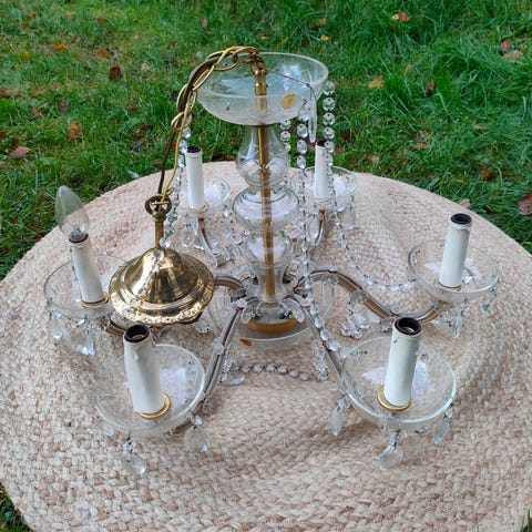 Kaikki kristallit tallella, 5- haarainen uusin ledilampuin, toimiva . Pakkaaminen pehmeästi onnistuu kyllä.