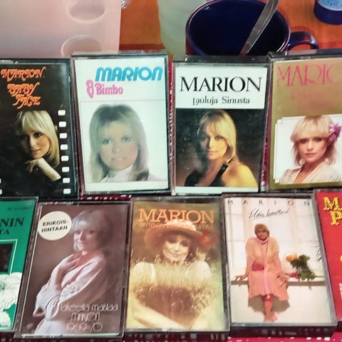 Marionin kasetti Rakkaus on hellyyttä vuodelta 1977. Kasetin kunto hyvä, vaikka etiketti värjäytynyt liiman kuivuttua ja hieman rispaantunut, tarkistuskuunneltu.