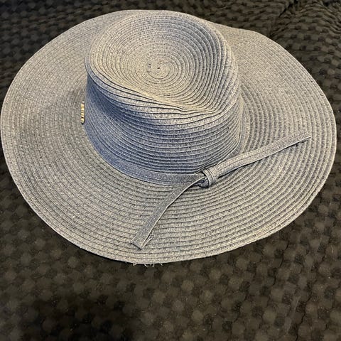 Kiva sininen denimhattu pienillä kukkakuvioilla. Nouto käteisellä tai pk.