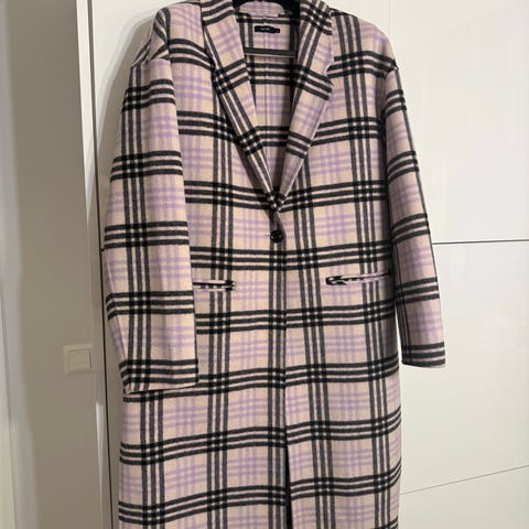 Takki on ruskean sävyinen ja valmistettu villasta. Takissa on ruutukuvio ja kaksi etutaskua. Varanappi tulee mukaan.