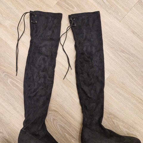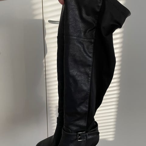 Myyntiin erittäin hyväkuntoiset naisten mustat keinonahkaiset ylipolvensaappaat.