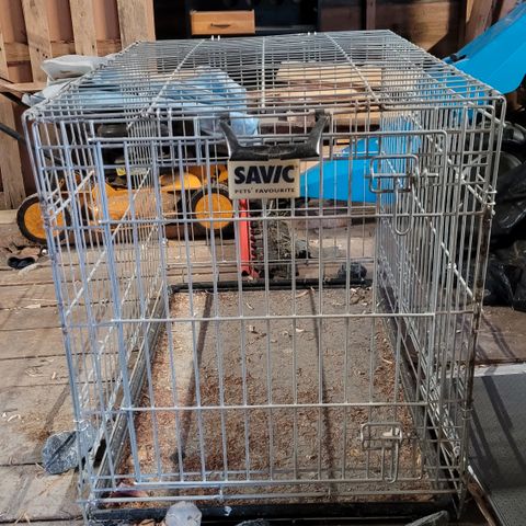 Puuilosta ostettu iso koiran häkki, joka on tarkoitettu sisätiloihin ja on hyvä kuntoinen. Häkissä kaksi ovea, joista toinen on sivussa ja toinen päädyssä. Häkki menee kasaan (viimeinen kuva).