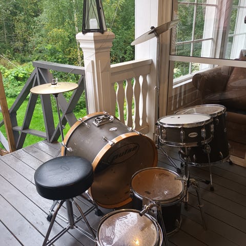 Bassorumpu, virveli, tomtom ja lautanen, lisäksi puukapulat ja jakkara. Pientä käytönjälkeä on, mutta kaikki on ehjää.