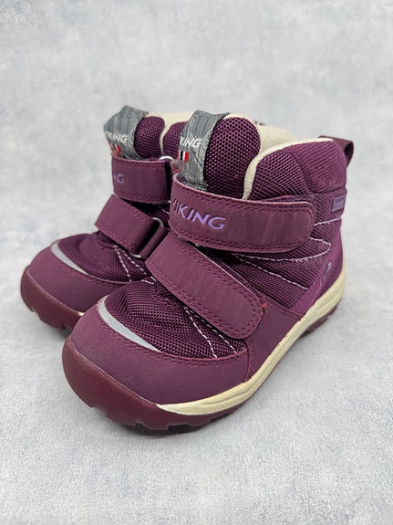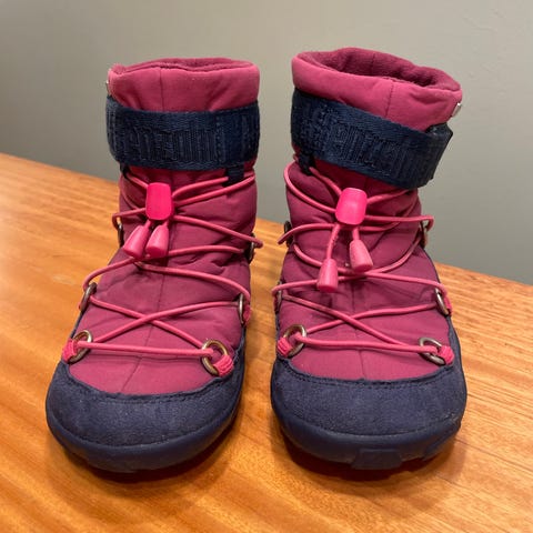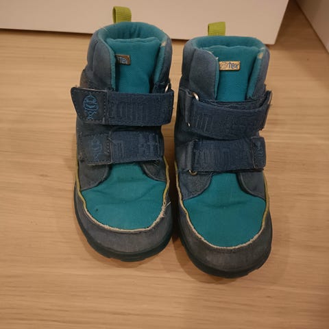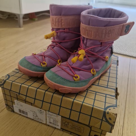 Hyväkuntoiset Affenzahnin paljasjalkakengät. Sisällä vuori, uudesta hieman jo painunut, mutta oikein siisti ja varmasti lämpimät kengät edelleen. Käyttölikaa pinnalla ja toisessa kengässä tumma tahra. Tarrat pitää erinomaisesti ja kengät on testattu juoksevan veden alla vedenpitäviksi. Todella joustava pohja.