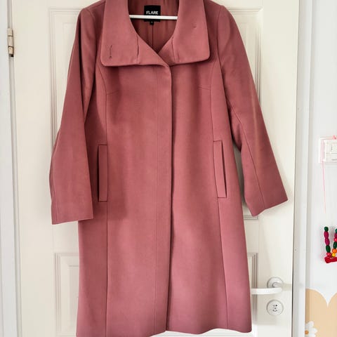Flare Collection naisten takki, koko 34, vastaa kuitenkin mielestäni M-kokoa. Takki on valmistettu laadukkaasta materiaalista (80% villaa, jossa on punertavan ja mustan sävyjä. Takissa on napitus edessä. Kunto: tosi hyvä.