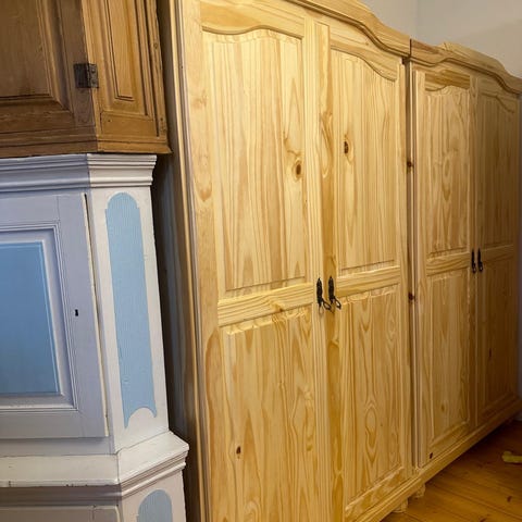 Puusepällä teetty puinen vaatekaappi, jossa alhaalla ja ylhäällä kaapit ja keskellä tilaa roikkuville vaatteille. Kauniit lasiovet. Kunto hyvä. Vain nouto Bulevardilta. Jos purat itse, hinta on 200 €, jos haluat sen valmiiksi purettuna, hinta on 300 €.