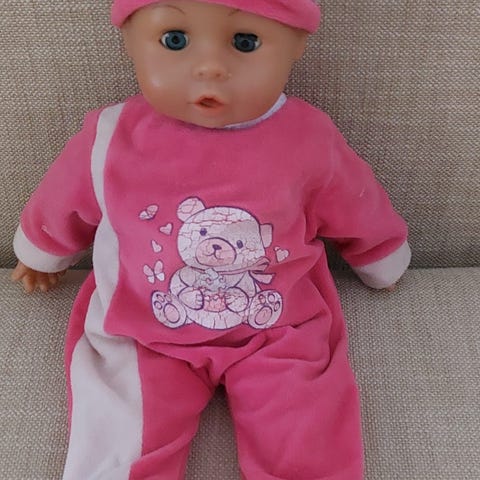 Useilla erilaisilla äänillä ääntelevä nukke. Korkeus 38 cm.