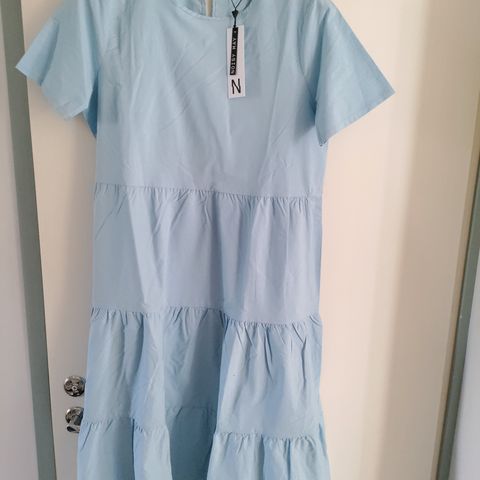 Helma takaa hiukan pidempi, hihansuissa napit, miehustassa napitus, mekkoon kuuluu vyö samasta kankaasta.