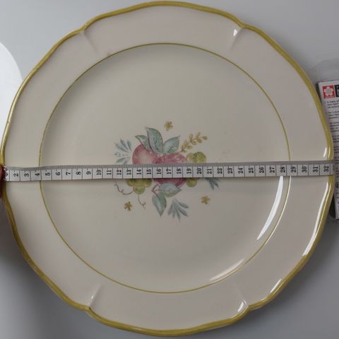 Arabia Sylvi lautanen, halkaisija noin 30 cm. Lautasessa on koristeellinen hedelmäkuvio ja kullanvärinen reuna. Valmistettu posliinista. Sopii erilaisiin kattauksiin ja käyttöön keittiössä. Nouto. Mobilepay/käteinen. Tarjoa.