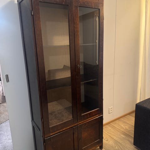 Vanha vitriini, jossa leveä laatikko ja lasiset liukuovet. Pöydän kannessa on kulumista, mutta meitä ei ole haitannut, kun päällä on ollut tavaraa tai pitsiliina.
