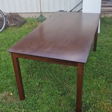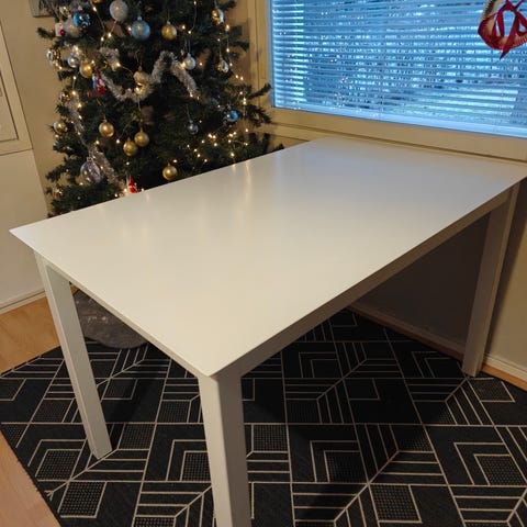 Siisti pöytä jossa yhdessä kulmassa pieni lohkeama (kuva). Pöytä ei ole maailman tukevin, mutta kyllä se kattauksen kestää. Tämä on luonnollisesti huomioitu hinnassa.
