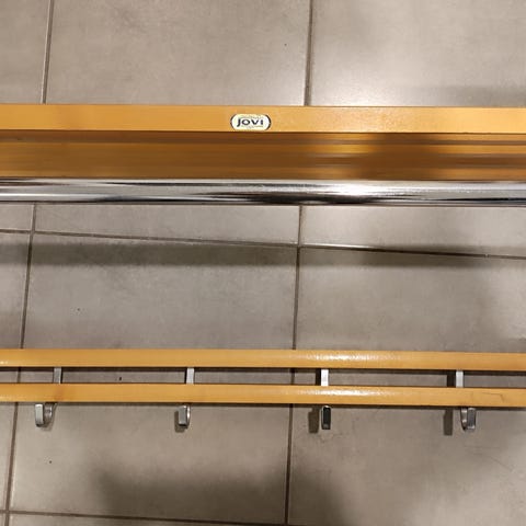 Jovi Lahti-merkkinen seinänaulakko hattuhyllyllä 1980-1990-luvuilta.