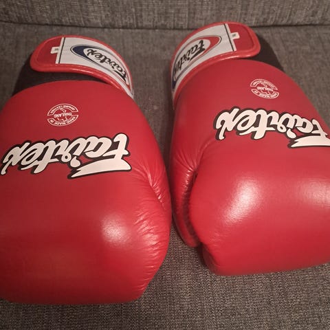Fairtex kamppailulajivälineet sisältävät mustat säärisuojat Koko M, valkoiset nyrkkeilyhanskat 14 oz, mustat kyynärsuojat Koko L, Shortsit Koko L, mustat rannesiteet ja alasuojat