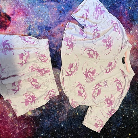 Lapsi myy Stitch-asuaan. Savuton ja lemmikitön koti. Koko 170, mutta niukkaa kokoa. Noin 164cm pituiselle varmaankin loistava.