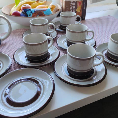 Arabia kahvikuppi ja lautanen setti ruskeaa väriä. Setti sisältää kuusi kahvikuppia ja kuusi lautasta. Materiaali keramiikka.