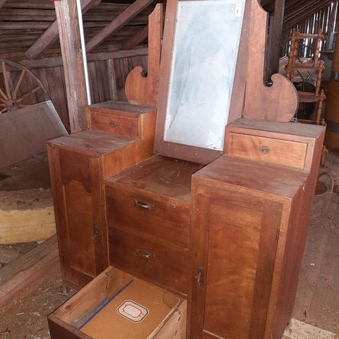 Suklaanruskea vintage peililipasto, jossa on kaksi laatikkoa ja kokovartalopeili. Peilin alla on hylly. Kaluste on yksinkertaisen tyylikäs ja muotoilultaan ajaton. Se on erittäin hyvässä kunnossa. Kaluste sopii moneen käyttöön ja paikkaan kotona.